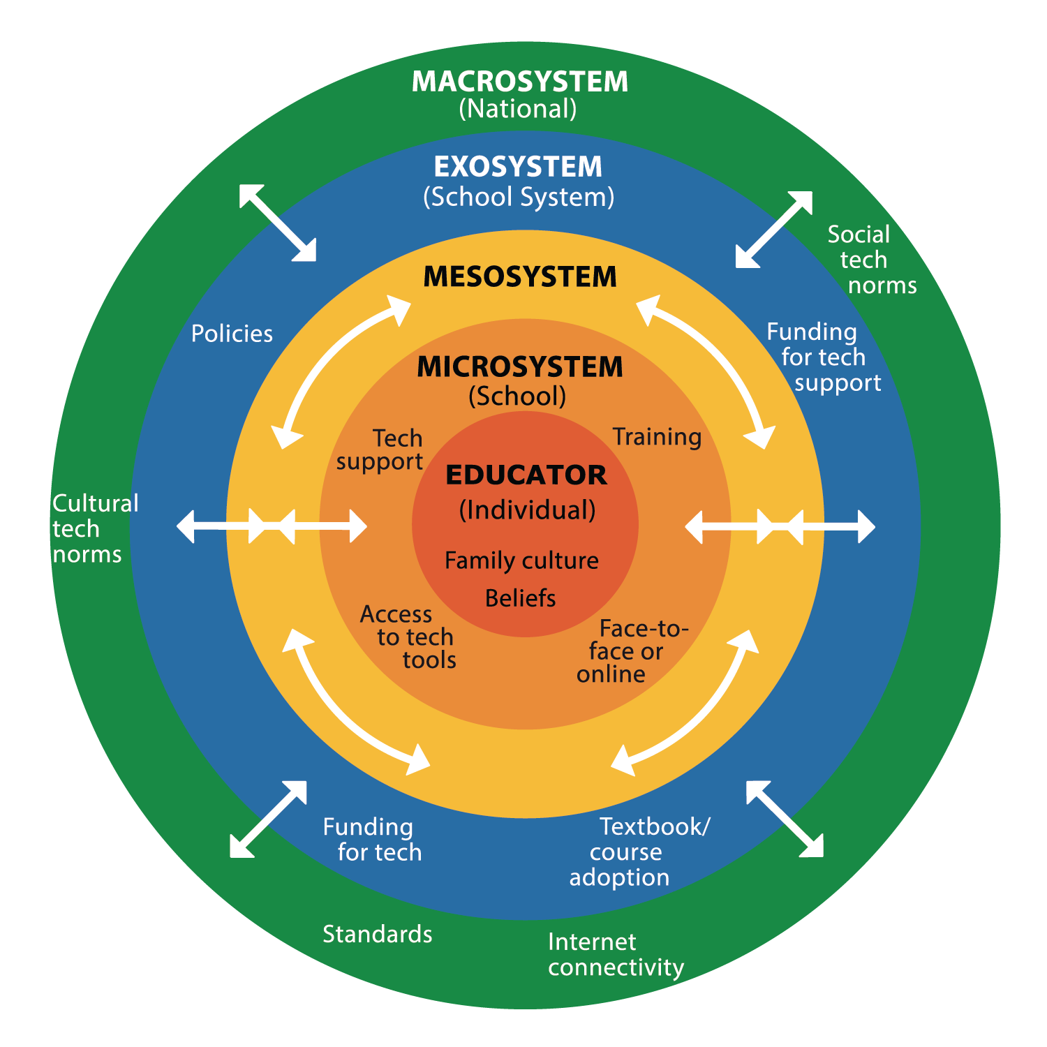 The educator integrating technology is in the center with the systems surrounding the educator. The school-to-national levels are highlighted to show what influences technology integration at each system level.